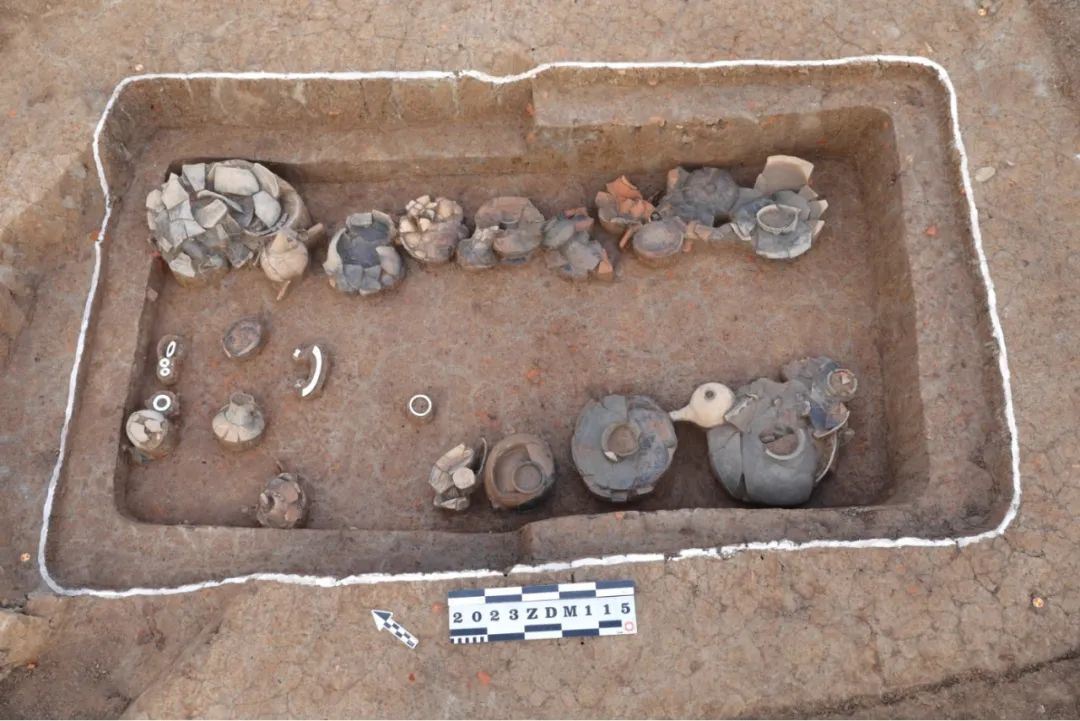 2023年以來,省文物考古研究院圍繞明晰遺址內(nèi)部布局和確認(rèn)遺址宏觀結(jié)構(gòu)兩個(gè)方面,再次開展對東山村遺址的主動(dòng)性考古發(fā)掘。截至目前,共發(fā)掘新石器時(shí)代大型紅燒土堆積4處、墓葬17座、房址1座、灰坑20座、灰溝1條、水井1口、柱洞3個(gè)。