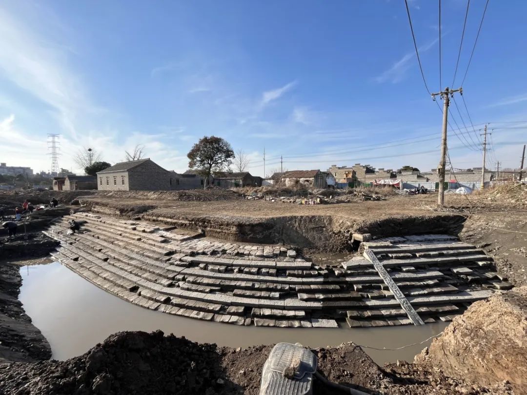2024年6月至10月,揚(yáng)州市文物考古研究所對子鹽碼頭遺址進(jìn)行了全面考古發(fā)掘??脊疟砻?,子鹽碼頭遺址位于十字河西北岸,為東北—西南走向,呈弧形,寬4.8-5米,全長約80米。碼頭由踏步石梯和垂帶石組成,踏步石梯殘存十三級臺階,由長方形條石壘砌而成,最底層臺階下栽有密集的圓木地釘作為碼頭基礎(chǔ)。碼頭南、中、北端共有4根長條狀垂帶石,飾有如意云紋和“福祿壽喜”紋飾。子鹽碼頭遺址東連都會橋、攔潮閘,西連九龍橋,是長江、運(yùn)河交匯處的重要?dú)v史見證,在大運(yùn)河、長江航運(yùn)史上發(fā)揮了重要作用,也是目前僅存的江北運(yùn)口遺跡,對研究和展示大運(yùn)河、長江航運(yùn)文化具有重要價(jià)值。