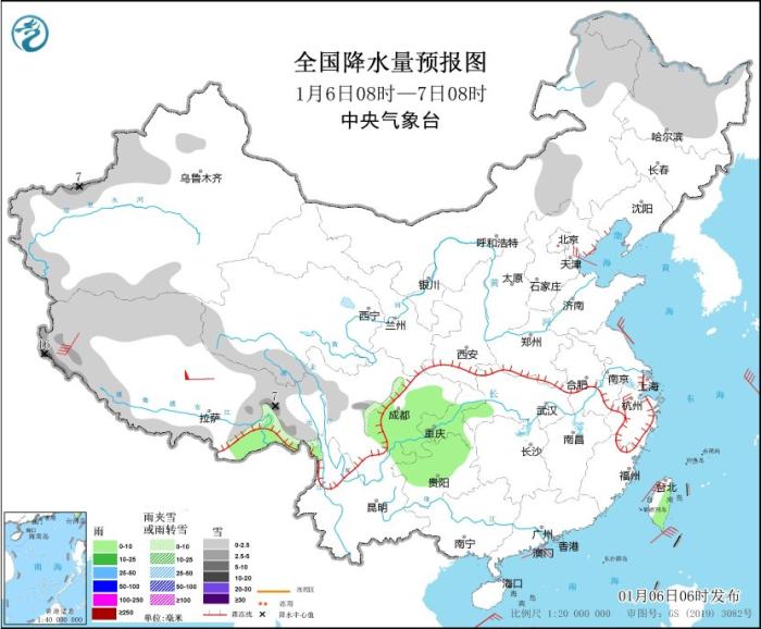 1月6日08時(shí)至7日08時(shí),內(nèi)蒙古中東部、黑龍江大部、新疆伊犁河谷和南疆盆地、西藏西部和東部、青海南部、川西高原北部、山東半島北部等地部分地區(qū)有小到中雪或雨夾雪,其中,新疆南疆西部山區(qū)、西藏西部等地部分地區(qū)有大雪,局地暴雪(10~16毫米)。西藏東南部、湖北西南部、重慶大部、貴州西北部、云南東北部、臺灣島東部等地部分地區(qū)有小雨。內(nèi)蒙古中東部、遼東半島、山東半島、浙江北部等地部分地區(qū)有4~6級風(fēng)(見圖1)。