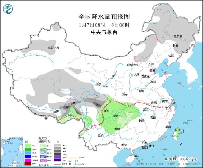 圖1 全國降水量預(yù)報(bào)圖(1月6日08時(shí)-7日08時(shí))