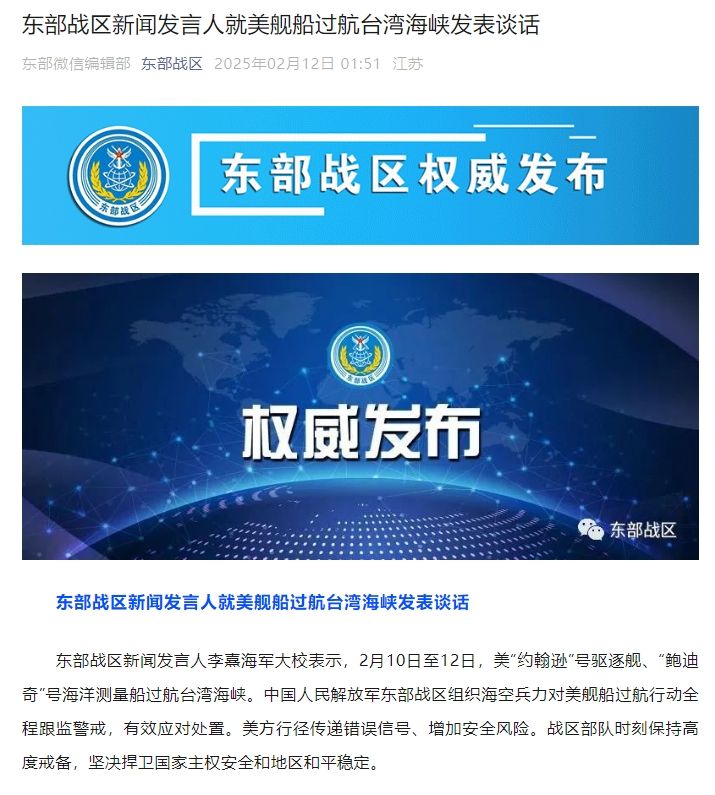 東部戰(zhàn)區(qū)新聞發(fā)言人李熹海軍大校表示,2月10日至12日,美“約翰遜”號驅(qū)逐艦、“鮑迪奇”號海洋測量船過航臺灣海峽。中國人民解放軍東部戰(zhàn)區(qū)組織海空兵力對美艦船過航行動全程跟監(jiān)警戒,有效應(yīng)對處置。美方行徑傳遞錯誤信號、增加安全風(fēng)險。戰(zhàn)區(qū)部隊時刻保持高度戒備,堅決捍衛(wèi)國家主權(quán)安全和地區(qū)和平穩(wěn)定。
