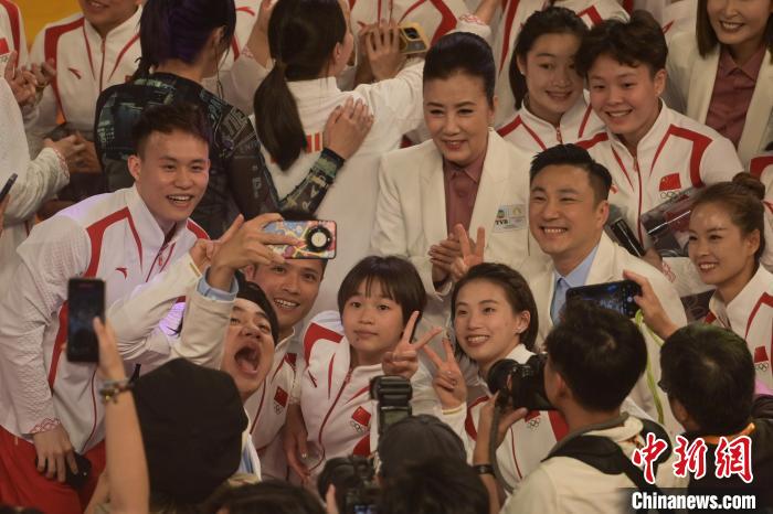 2024年8月30日,訪港的中國內(nèi)地奧運健兒出席奧運健兒大匯演。圖為香港藝人與奧運健兒自拍。 中新社記者 陳永諾 攝