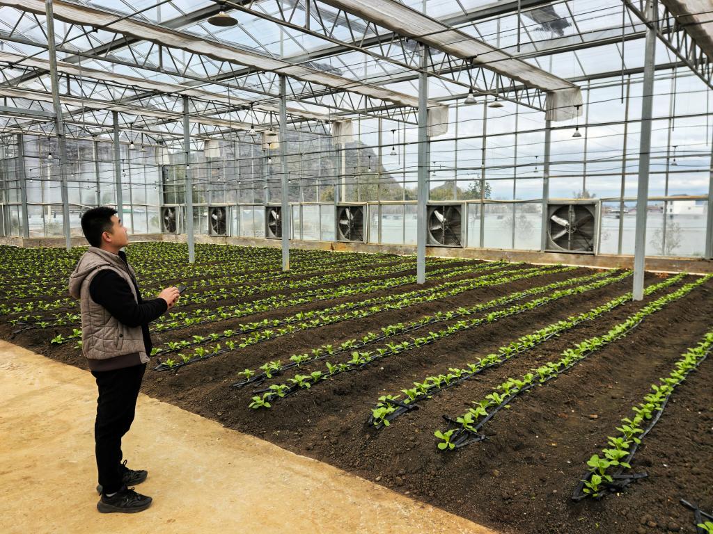 廣西賀州市平桂區(qū)國(guó)家現(xiàn)代農(nóng)業(yè)產(chǎn)業(yè)園品種篩選適應(yīng)棚內(nèi),技術(shù)人員陳愈璋利用手機(jī)操控大棚農(nóng)業(yè)設(shè)施。新華社記者王楚然 攝