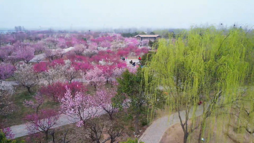 春日里,鄭州市惠濟(jì)區(qū)黃河灘地公園黃河梅園中的梅花次第開放,眾多賞花的游客紛紛前來打卡。(龐錦鵬 攝制)