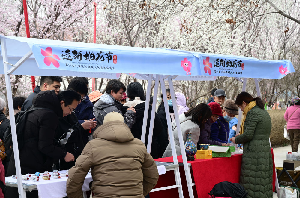 3月15日,游客在天津市紅橋區(qū)北運(yùn)河畔桃花堤設(shè)置的市集上選購文創(chuàng)產(chǎn)品。新華社記者 趙子碩 攝