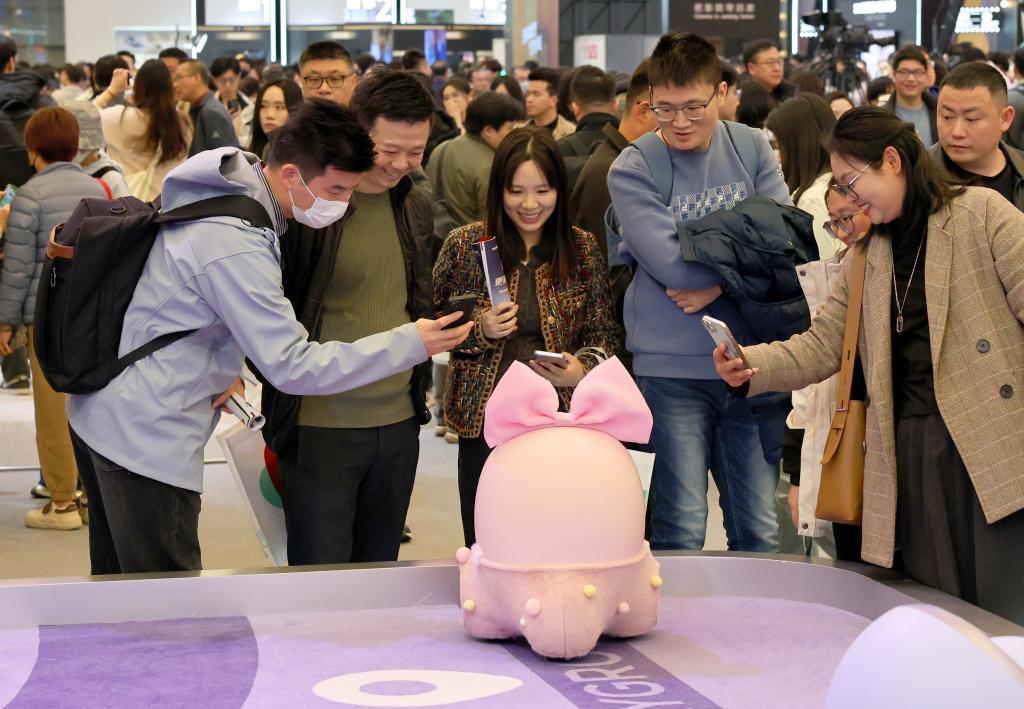 3月20日,參觀者在展會(huì)上與“Ai Me智能機(jī)器人”互動(dòng)。當(dāng)日,以“AI科技、AI生活”為主題的2025中國(guó)家電及消費(fèi)電子博覽會(huì)(AWE2025)在上海新國(guó)際博覽中心開(kāi)幕。本屆展會(huì)吸引全球千余家企業(yè)參展,全景展示家電及消費(fèi)電子領(lǐng)域的前沿成果,呈現(xiàn)AI賦能智慧生活的新產(chǎn)品、新方案、新場(chǎng)景。(新華社記者 方喆 攝)