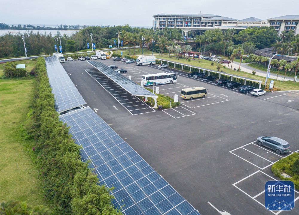 ↑ 在博鰲零碳示范區(qū)拍攝的建有光伏發(fā)電設(shè)備的停車場(無人機(jī)照片,3月16日攝)。