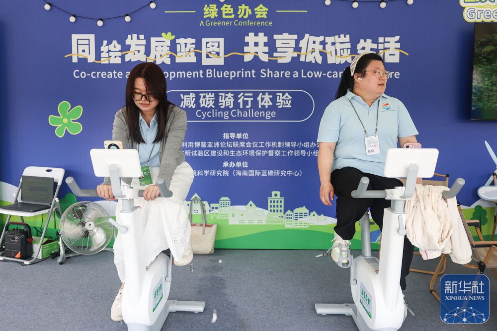 ↑ 3月25日,參會人員在博鰲東嶼島文化公園內(nèi)體驗(yàn)減碳騎行活動(dòng)。