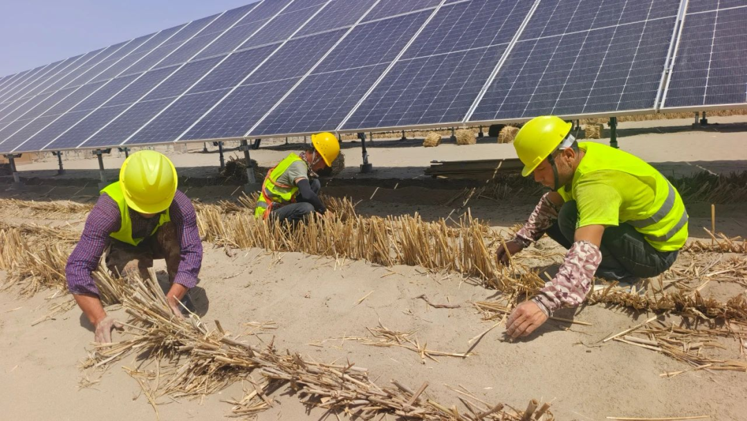 3月28日,在中國電建集團(tuán)新疆分公司新能源公司沙雅縣25萬千瓦光伏項(xiàng)目施工現(xiàn)場,工人們正緊張地安裝光伏板,周圍草方格的鋪設(shè)及梭梭的栽種也在同步開展當(dāng)中。該項(xiàng)目施工負(fù)責(zé)人郝澤權(quán)說,光伏發(fā)電助力機(jī)電井抽取沙漠地表百米以下的微咸水灌溉梭梭林,解決了長期以來沙漠植綠缺水難題,實(shí)現(xiàn)生態(tài)與經(jīng)濟(jì)的雙重收益。