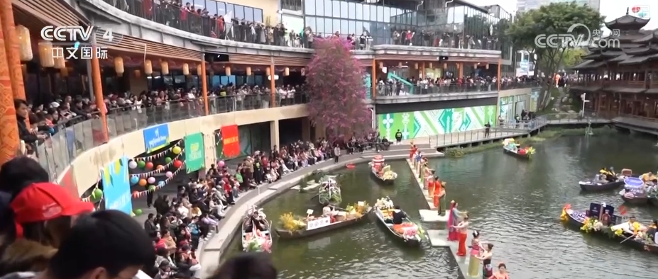 南寧民歌湖的民歌廣場是2025年廣西“三月三”的主會場。在水上主舞臺表演的是來自全國各地“四季村歌”歌隊(duì)的十幾個(gè)代表隊(duì)。2025年的廣西“三月三”主會場還有很多有意思的設(shè)置。比如,“有得花”鮮花市集、“有得耍”科技潮玩市集、“有得吃”東南亞風(fēng)情水上市集等。