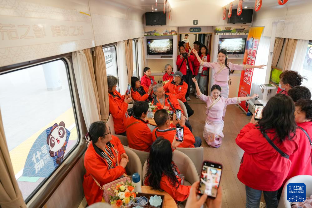 3月28日,在Y471次“熊貓專(zhuān)列·什邡號(hào)”列車(chē)上,旅客們?cè)谟^看云南民族舞蹈表演。