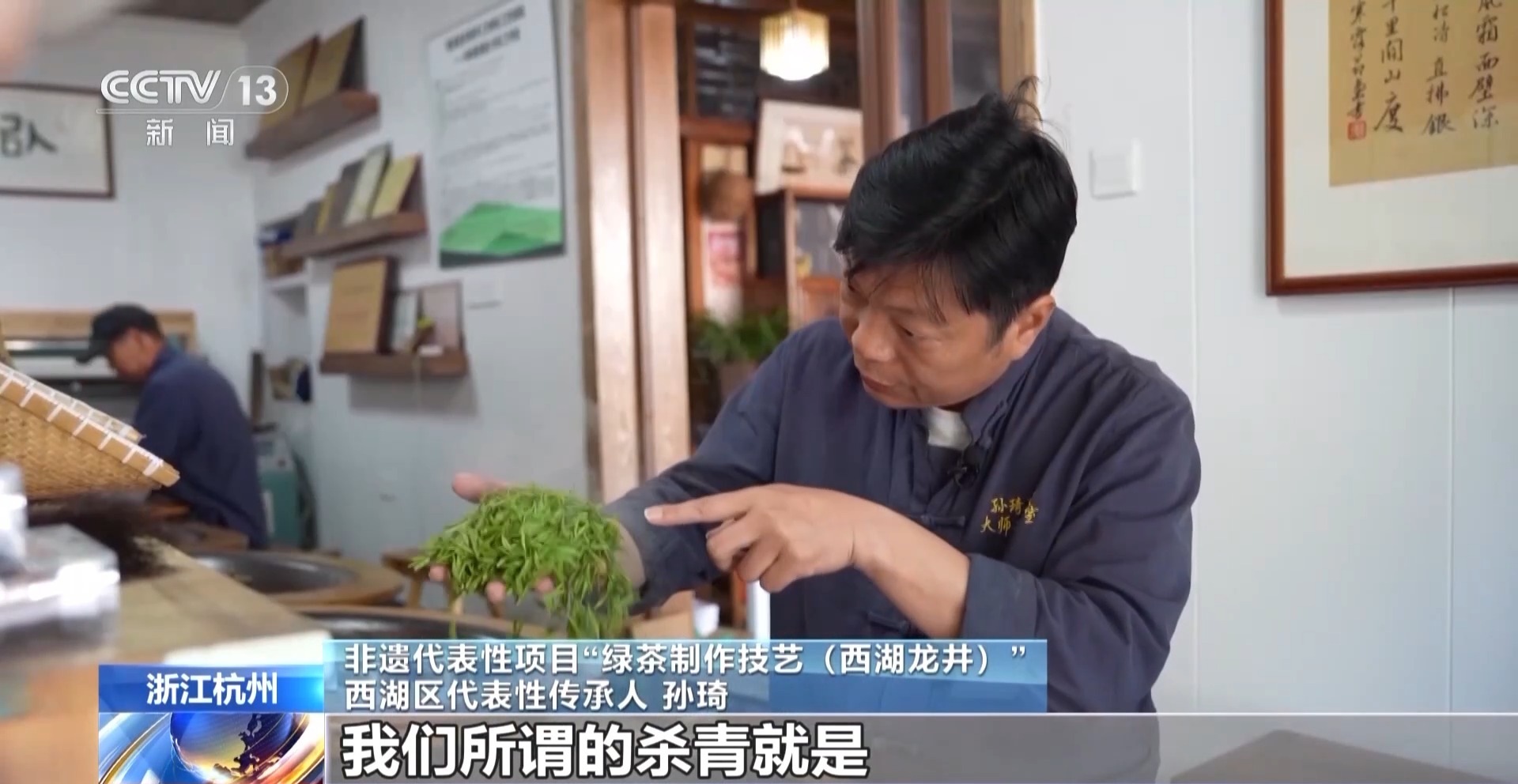 非遺代表性項目“綠茶制作技藝(西湖龍井)”西湖區(qū)代表性傳承人 孫琦:殺青就是讓它快速地走水,西湖龍井是色綠、香郁、味甘、形美。