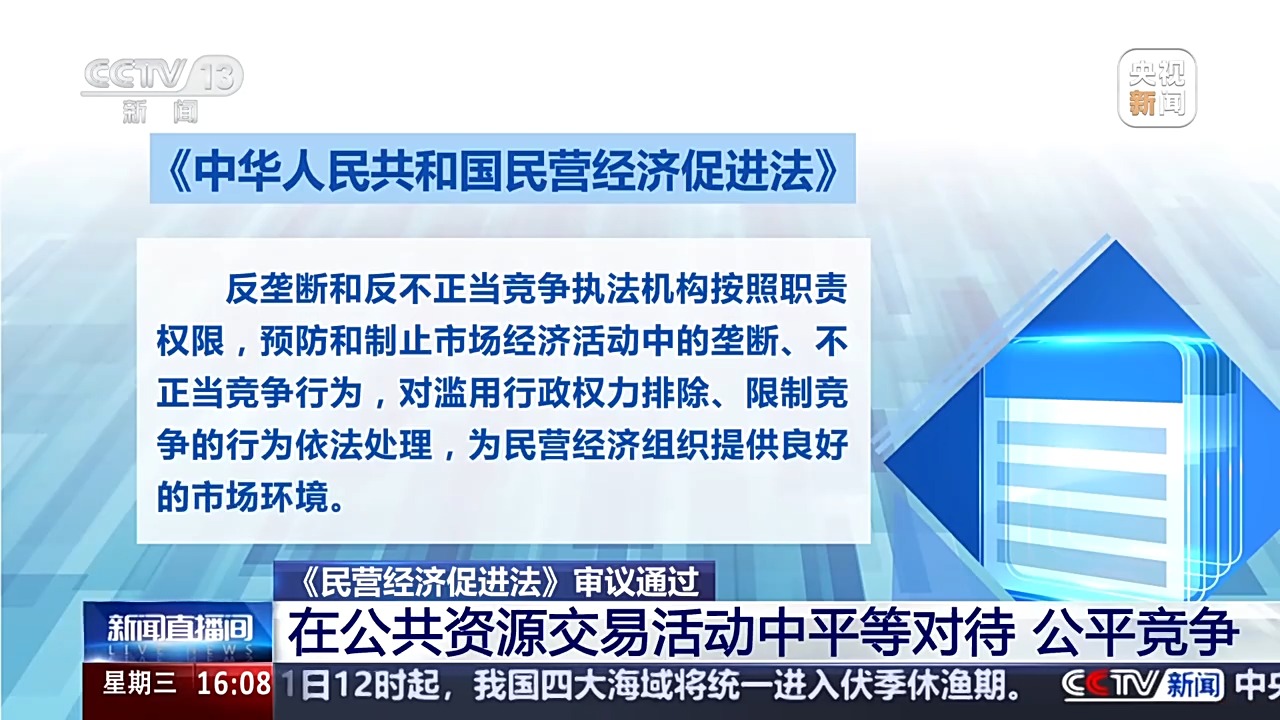 全國人大常委會法工委經濟法室主任 楊合慶:針對民營經濟發(fā)展中面臨的公平競爭、投資融資、科技創(chuàng)新、服務保障、權益保護以及民營經濟自身發(fā)展存在的問題和薄弱環(huán)節(jié),充分吸收改革成果和實踐經驗,有針對性地細化、完善相關制度措施,并與有關法律規(guī)定作好銜接。