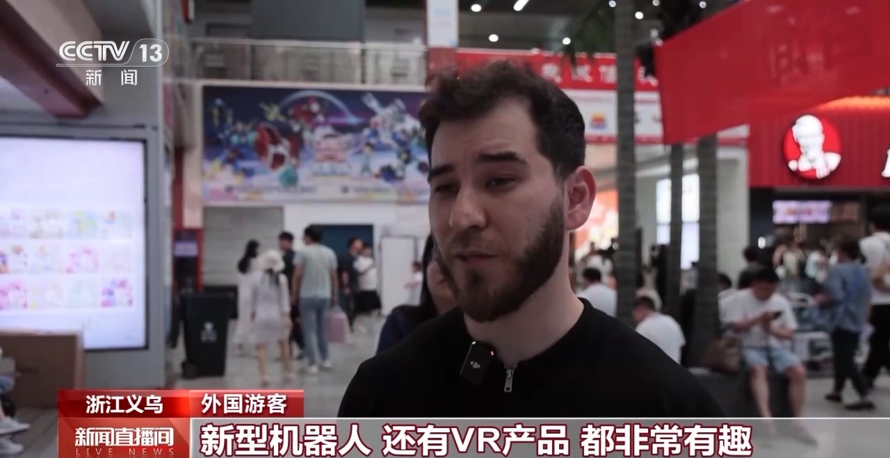 外國游客:我的朋友們是第一次來義烏,他們都很喜歡義烏,因?yàn)檫@里的產(chǎn)品都很有意思,吃住也都很舒適。我們剛剛在體驗(yàn)AR產(chǎn)品、新型機(jī)器人、VR產(chǎn)品,都非常有趣。