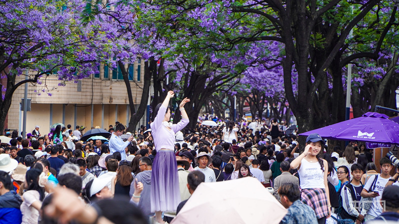 “五一”假期,前來(lái)昆明教場(chǎng)中路觀賞藍(lán)花楹的游客絡(luò)繹不絕(央廣網(wǎng)記者 魏文青 攝)