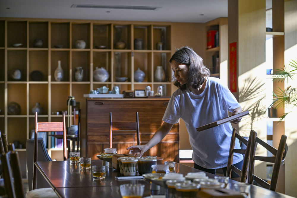 工作人員在長守戲劇谷內(nèi)一家咖啡廳內(nèi)布置