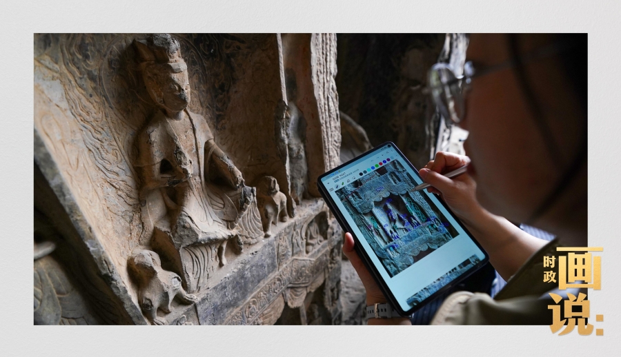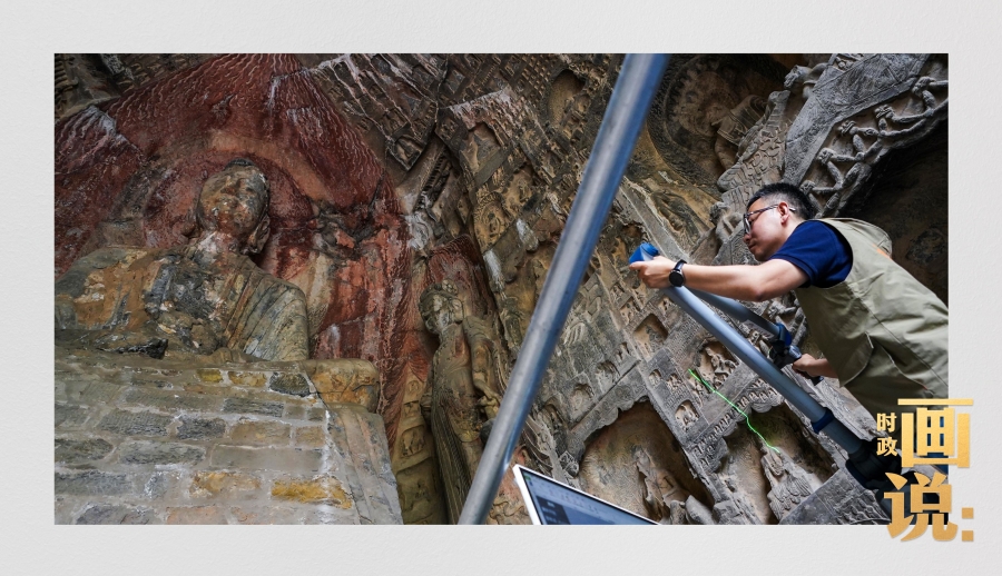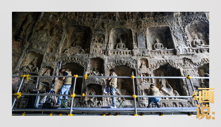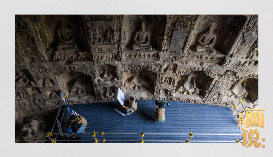 龍門石窟研究院工作人員在古陽洞使用關節(jié)臂掃描儀對佛像進行數字化掃描
