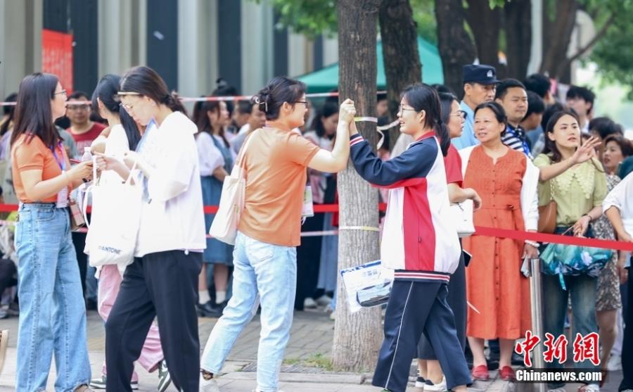 資料圖:2024年6月7日,湖北省武漢市長虹中學(xué)考點(diǎn),考生入場前與送考老師擊掌。張暢 攝