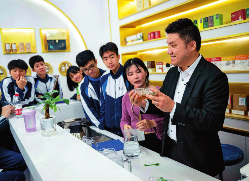 澳門居民黃滋才(右一)在位于橫琴的分子態(tài)(珠海橫琴)中醫(yī)藥健康產(chǎn)業(yè)發(fā)展有限公司的植物(現(xiàn)代中藥)分子博物館內(nèi)與澳門勞校中學的學生交流(2024年12月11日攝)新華社發(fā)(張金加攝)