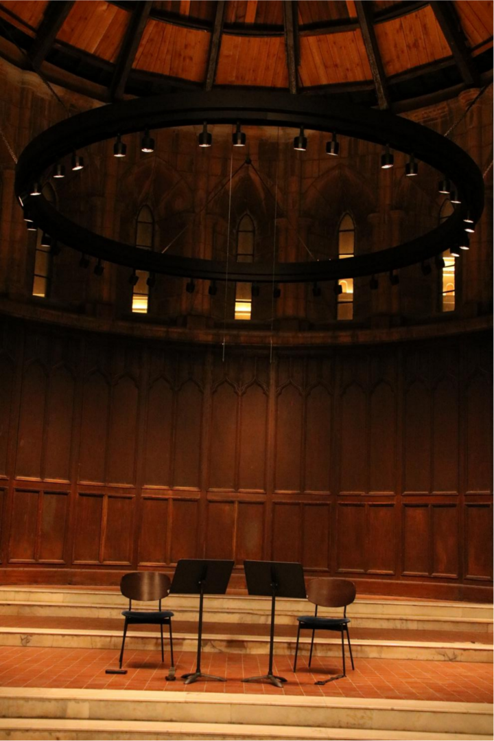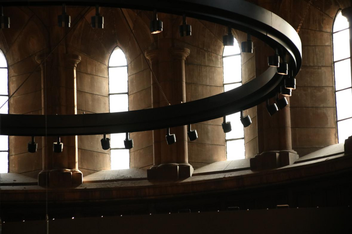 在原來(lái)祭臺(tái)的中間,現(xiàn)在改造為演講、演奏的環(huán)形中心臺(tái)。上方是一個(gè)中央環(huán)形燈,在沒亮燈之前就像一條烏黑色的緞帶,神秘且漂亮。