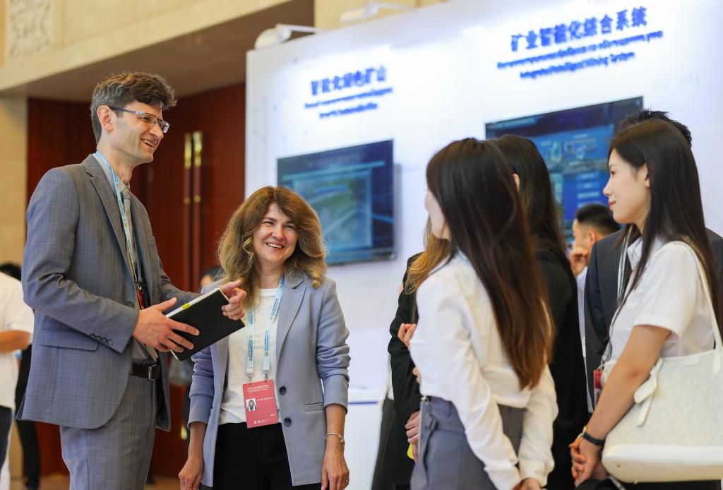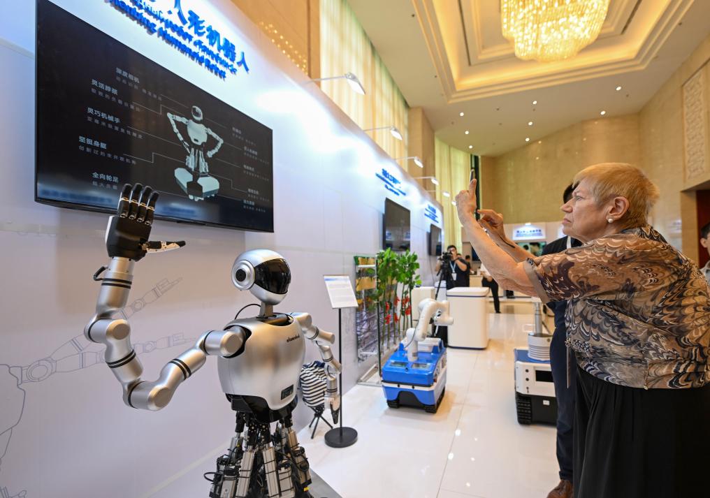 7月11日,參會(huì)嘉賓在2025上合組織數(shù)字經(jīng)濟(jì)論壇互動(dòng)體驗(yàn)區(qū)與參展企業(yè)工作人員交流。新華社記者 孫凡越 攝