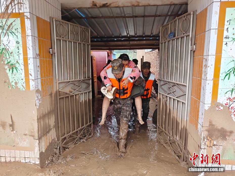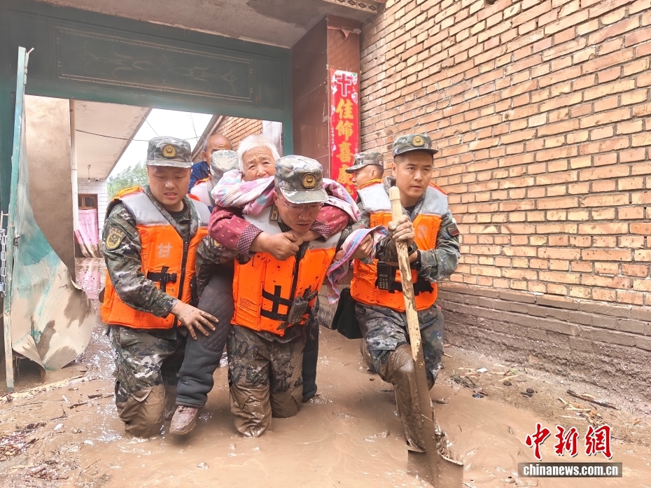 8月8日,武警甘肅總隊(duì)機(jī)動(dòng)支隊(duì)官兵在甘肅省蘭州市榆中縣興隆山村轉(zhuǎn)移被困群眾。劉昆 攝