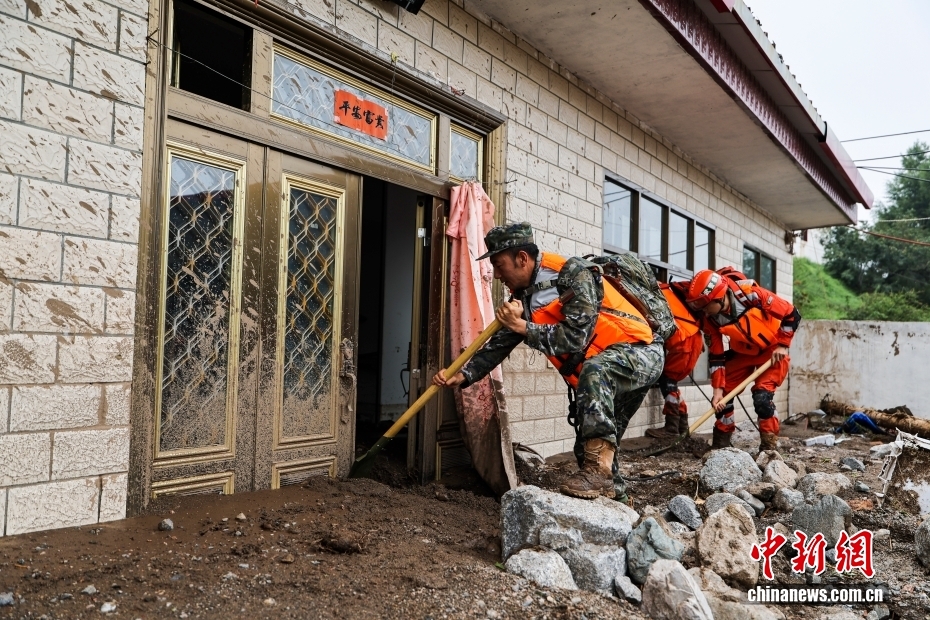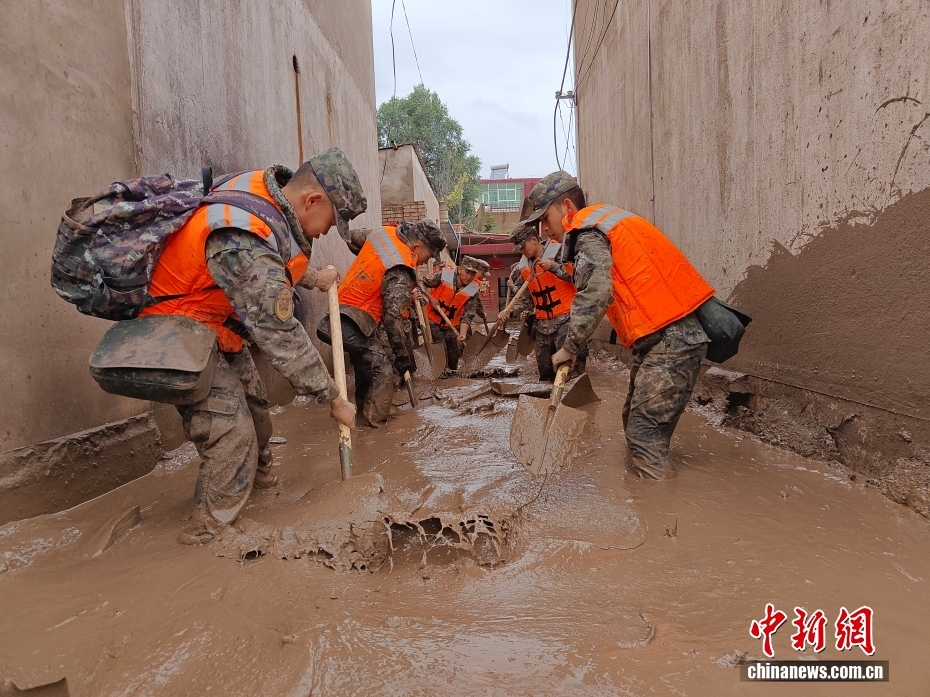 8月8日,武警甘肅總隊(duì)機(jī)動(dòng)支隊(duì)官兵在甘肅省蘭州市榆中縣興隆山村清理淤泥。劉昆 攝