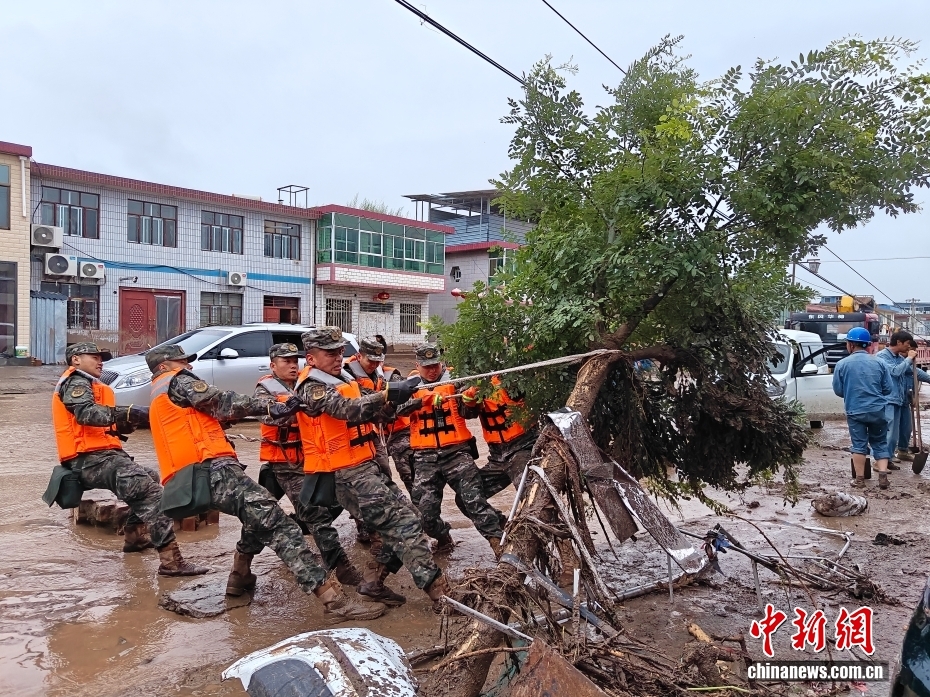 8月8日,武警甘肅總隊(duì)機(jī)動(dòng)支隊(duì)官兵在甘肅省蘭州市榆中縣興隆山村挪移損毀樹木。劉昆 攝