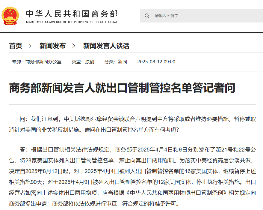 商務(wù)部新聞發(fā)言人就出口管制管控名單答記者問(wèn)