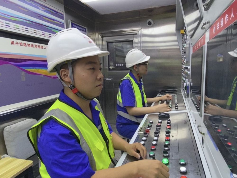 圖為中鐵十四局甬舟鐵路項(xiàng)目盾構(gòu)機(jī)長(zhǎng)栗晨(左一)在盾構(gòu)機(jī)駕駛室內(nèi)操作。新華社記者魏一駿 攝