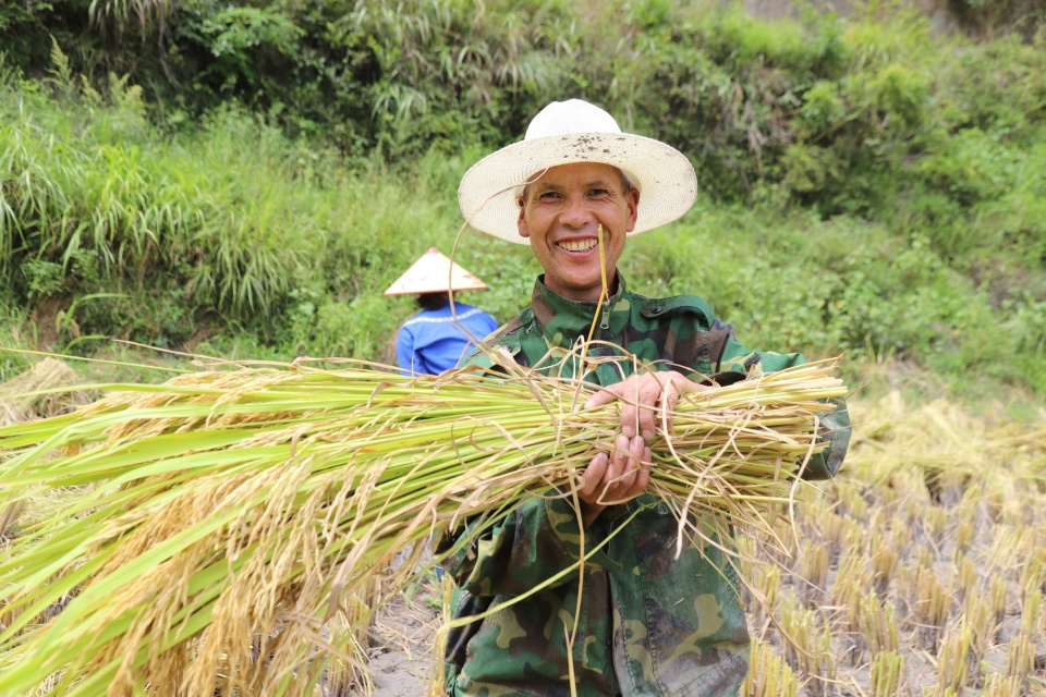 貴州省黔東南州鎮(zhèn)遠(yuǎn)縣報(bào)京鄉(xiāng)的農(nóng)戶(hù)展示稻穗,臉上洋溢著笑容(央廣網(wǎng)發(fā) 張佳怡 攝)