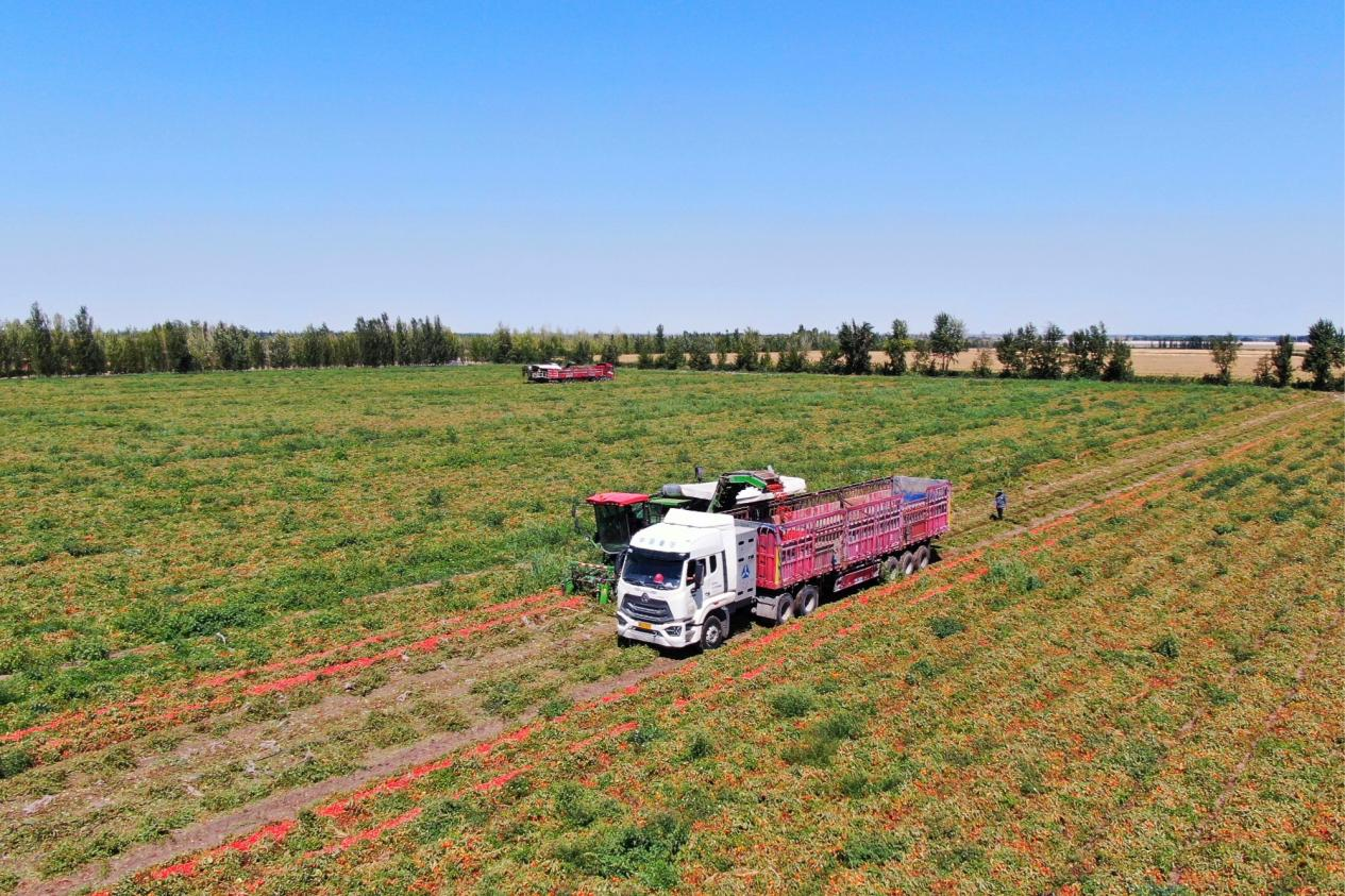 吉木薩爾縣三臺(tái)鎮(zhèn)的1200余畝加工番茄迎來(lái)了豐收季。在羊圈臺(tái)子村,種植戶(hù)俞瑞海家的300畝番茄地里,現(xiàn)代化采收機(jī)械正來(lái)回穿梭。