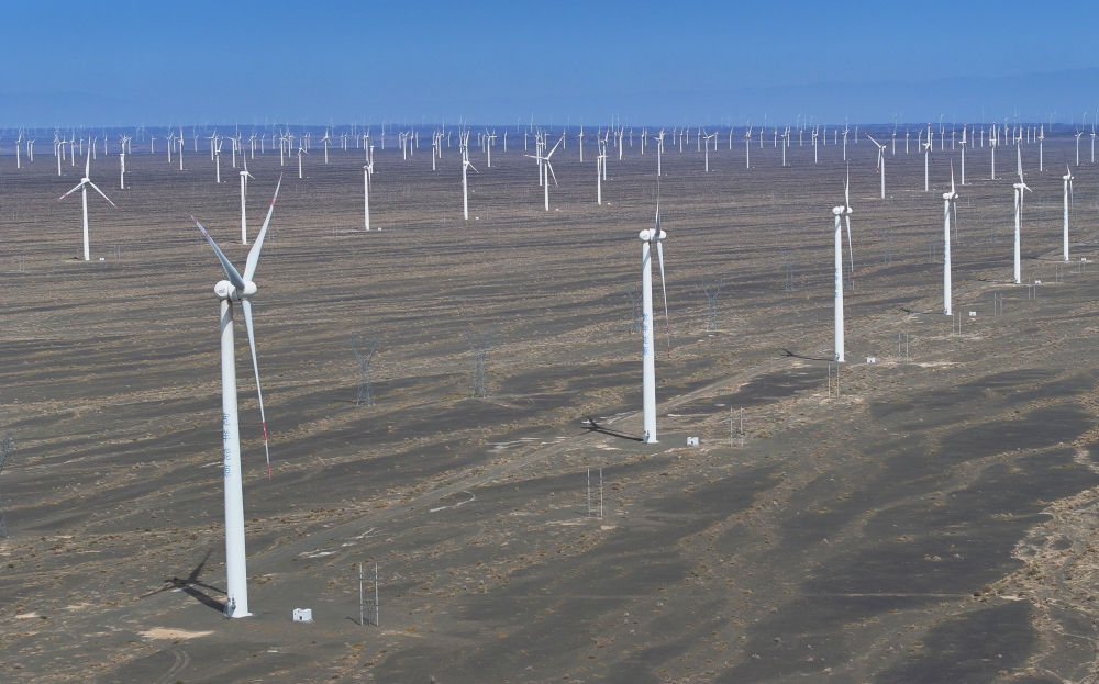在新疆哈密地區(qū)巴里坤哈薩克自治縣拍攝的三塘湖風(fēng)電場(4月27日攝,無人機照片)。