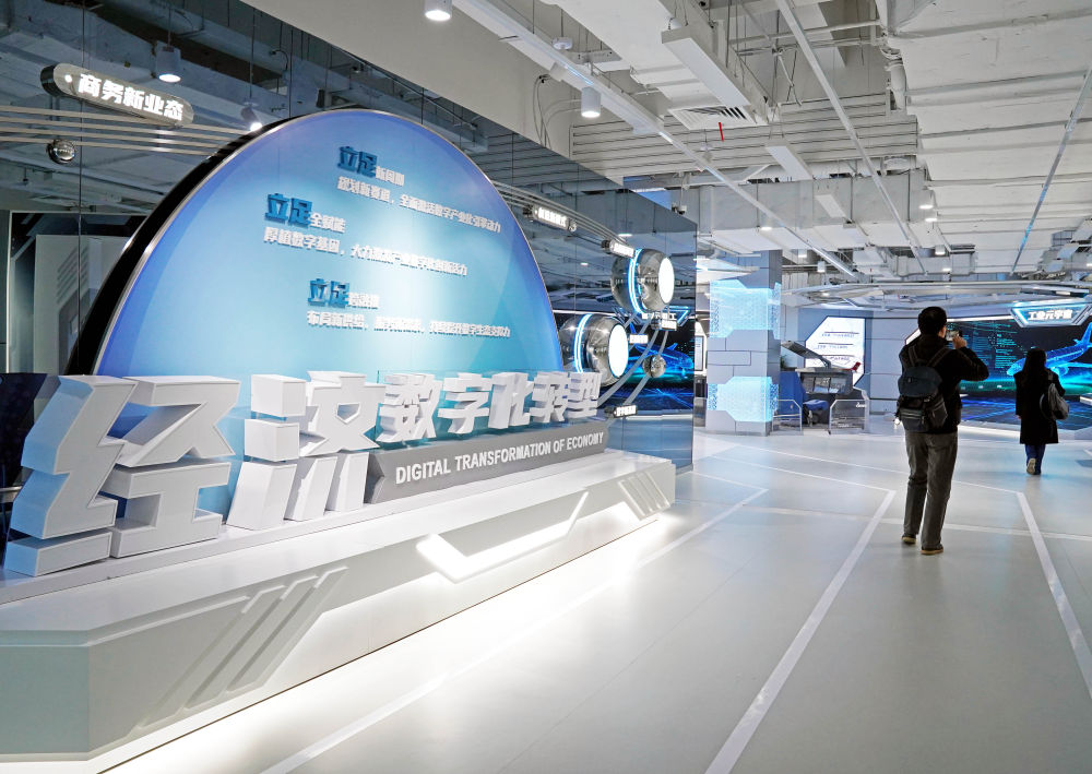 觀(guān)眾在位于上海市楊浦區(qū)景星路的上海城市數(shù)字化轉(zhuǎn)型體驗(yàn)館參觀(guān)(2023年4月7日攝)。該館展示上海各方面數(shù)字化轉(zhuǎn)型的規(guī)劃布局和最新實(shí)踐。