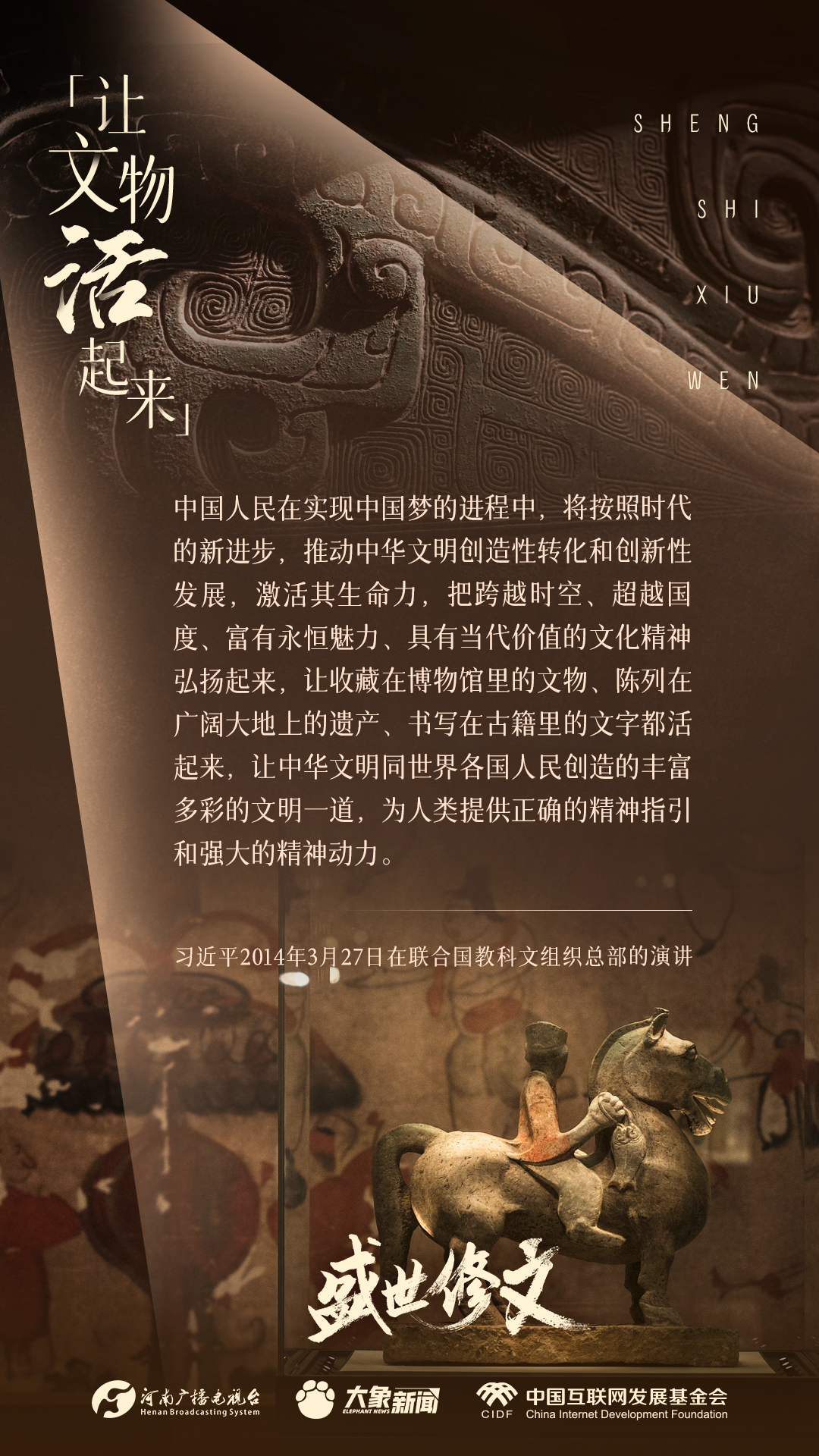 河南廣播電視臺大象新聞大型融媒體報道《盛世修文》,深入闡釋習(xí)近平文化思想,著力推進黨的創(chuàng)新理論飛入尋常百姓家。