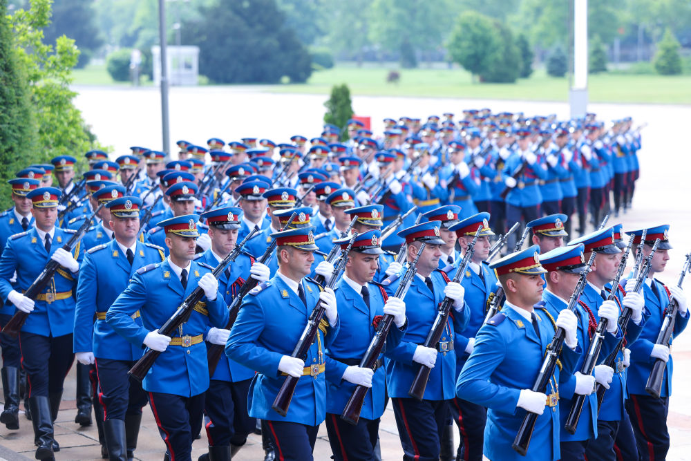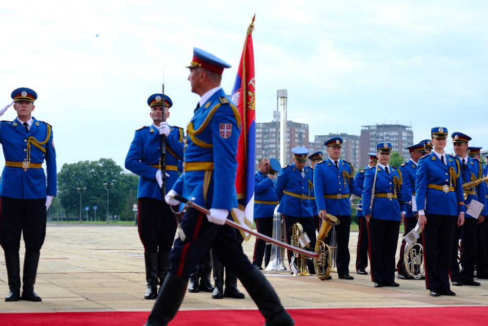塞爾維亞大廈前,中塞兩國國旗迎風飄揚,儀仗隊威武雄壯。
