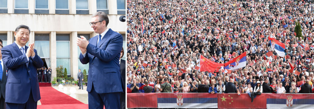 當(dāng)?shù)貢r(shí)間5月8日上午,國家主席習(xí)近平在貝爾格萊德塞爾維亞大廈同塞爾維亞總統(tǒng)武契奇舉行會(huì)談。會(huì)談前,武契奇陪同習(xí)近平來到政府大廈平臺(tái)(左圖)。大廈廣場上,一萬五千名塞爾維亞民眾揮舞中塞兩國國旗,對(duì)習(xí)近平表示最熱烈的歡迎(右圖)。