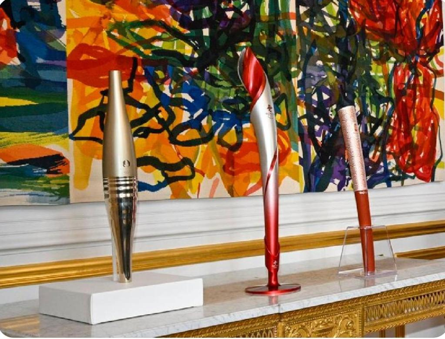 在法國愛麗舍宮一層肖像廳,三支奧運火炬并排而立,格外引人注目。這是中法兩國元首夫婦互贈禮品之一。
