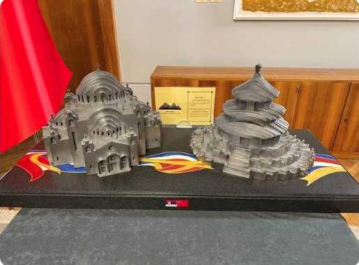 習(xí)近平主席送給武契奇兩件工藝品,分別是鋼材質(zhì)的天壇和圣薩瓦教堂造型。