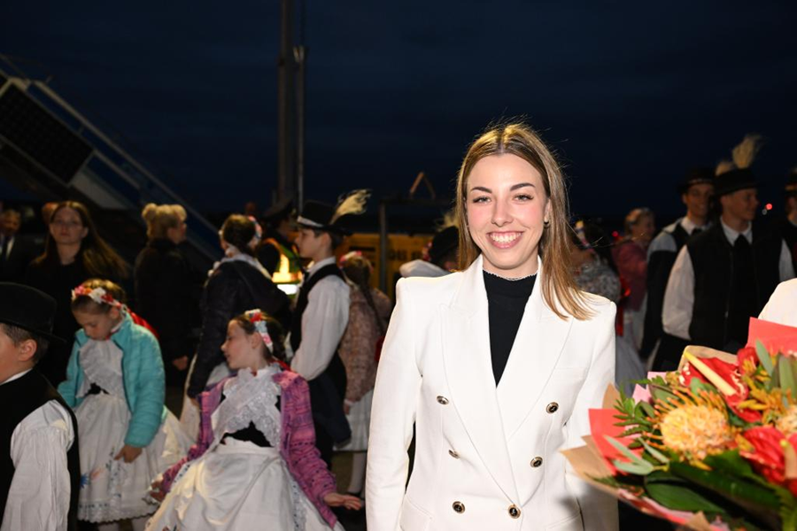 當?shù)貢r間5月8日晚,在匈牙利布達佩斯國際機場歡迎隊伍中的匈牙利姑娘歐拉·塔瑪拉。新華社記者 謝環(huán)馳 攝