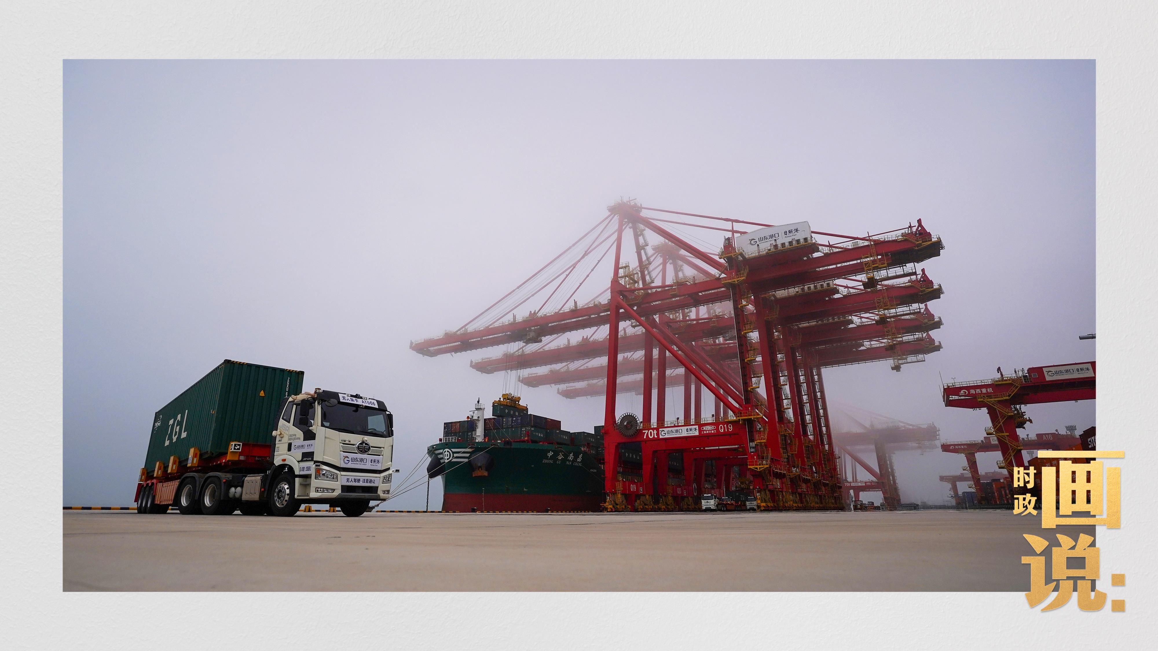 山東港口集團日照港順岸開放式全自動化集裝箱碼頭,無人集卡車在運送集裝箱。