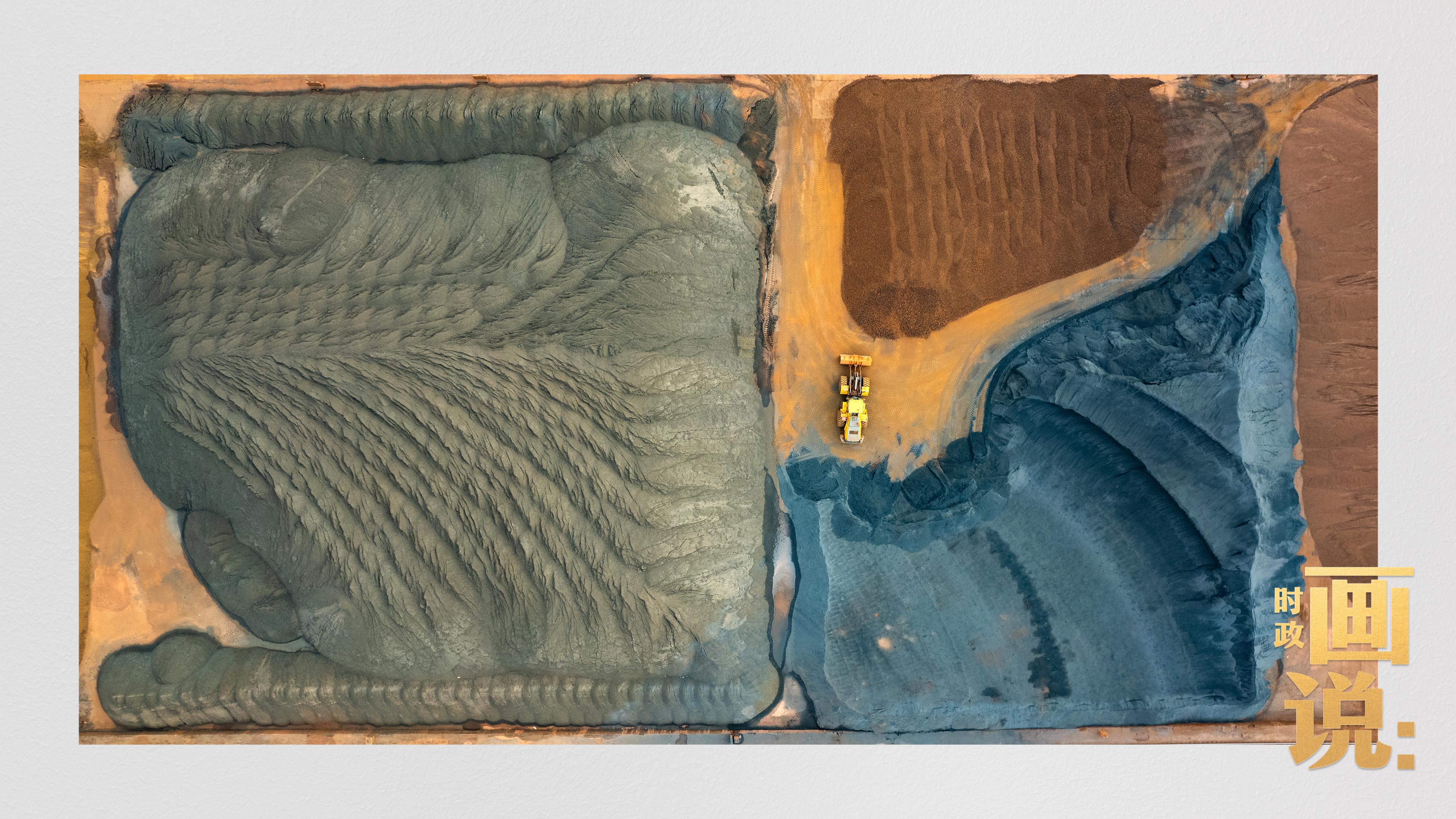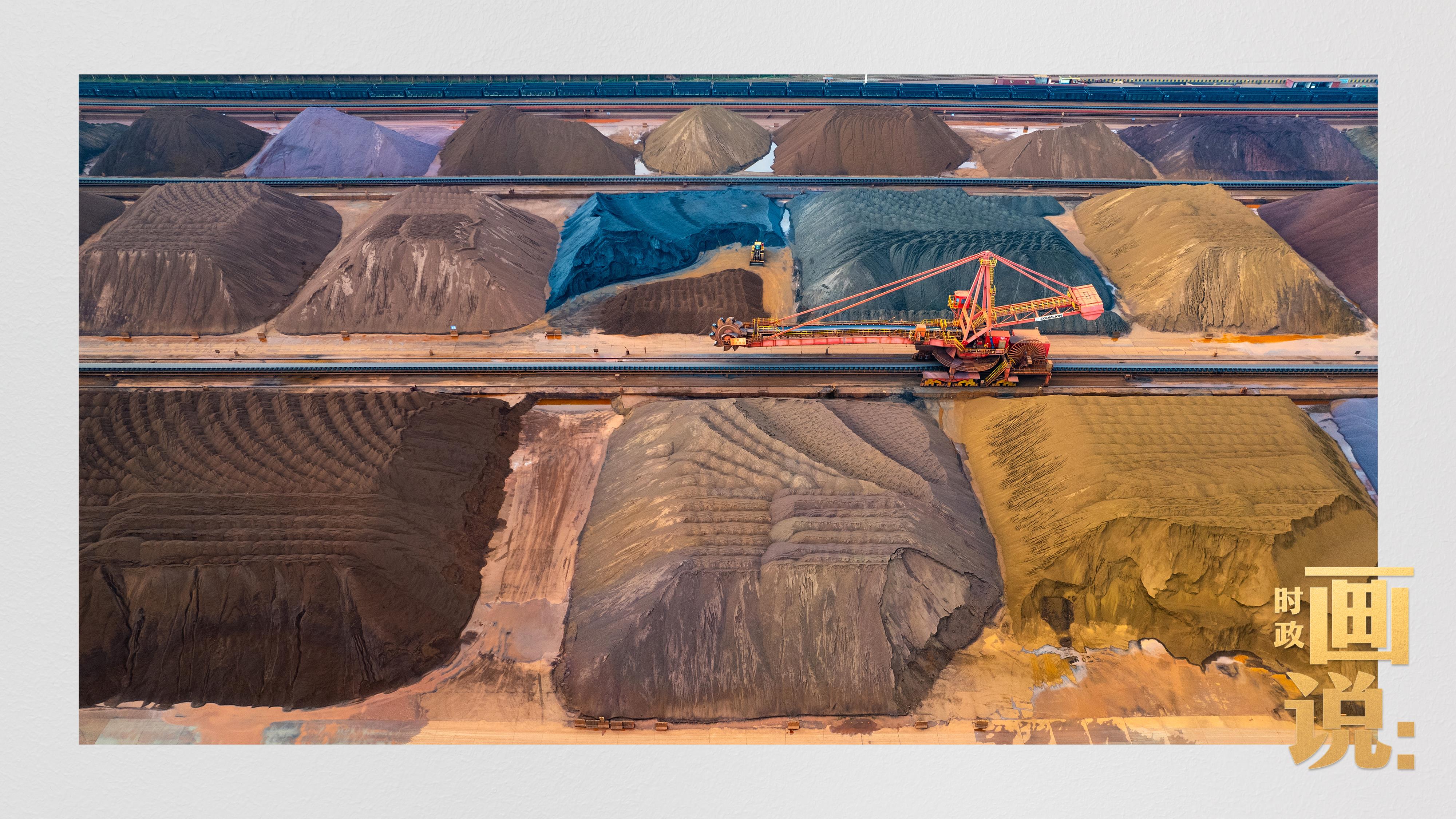 △港區(qū)內(nèi)的礦石堆場整理堆放著五顏六色的各類礦石、礦砂,宛如油畫。