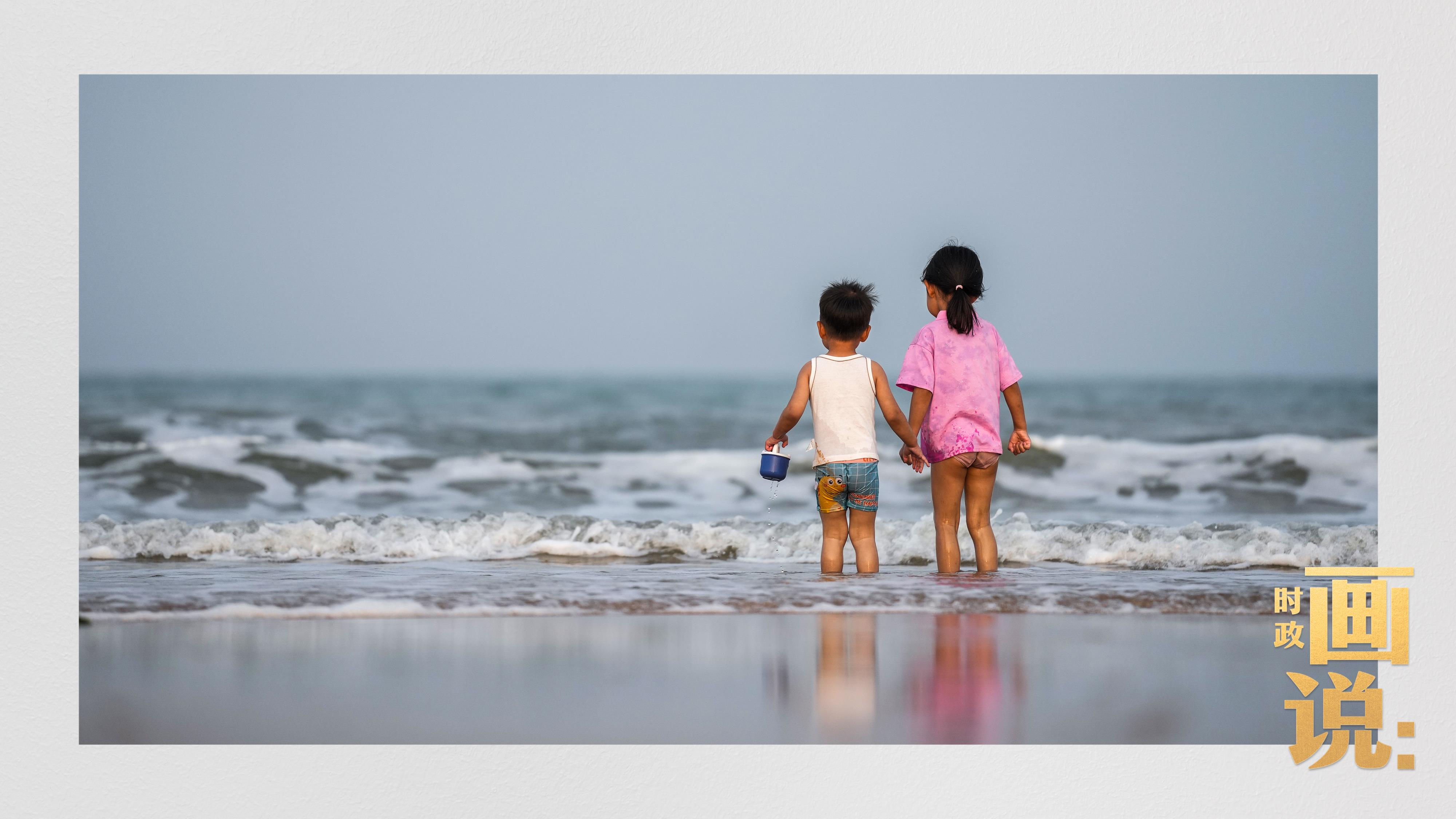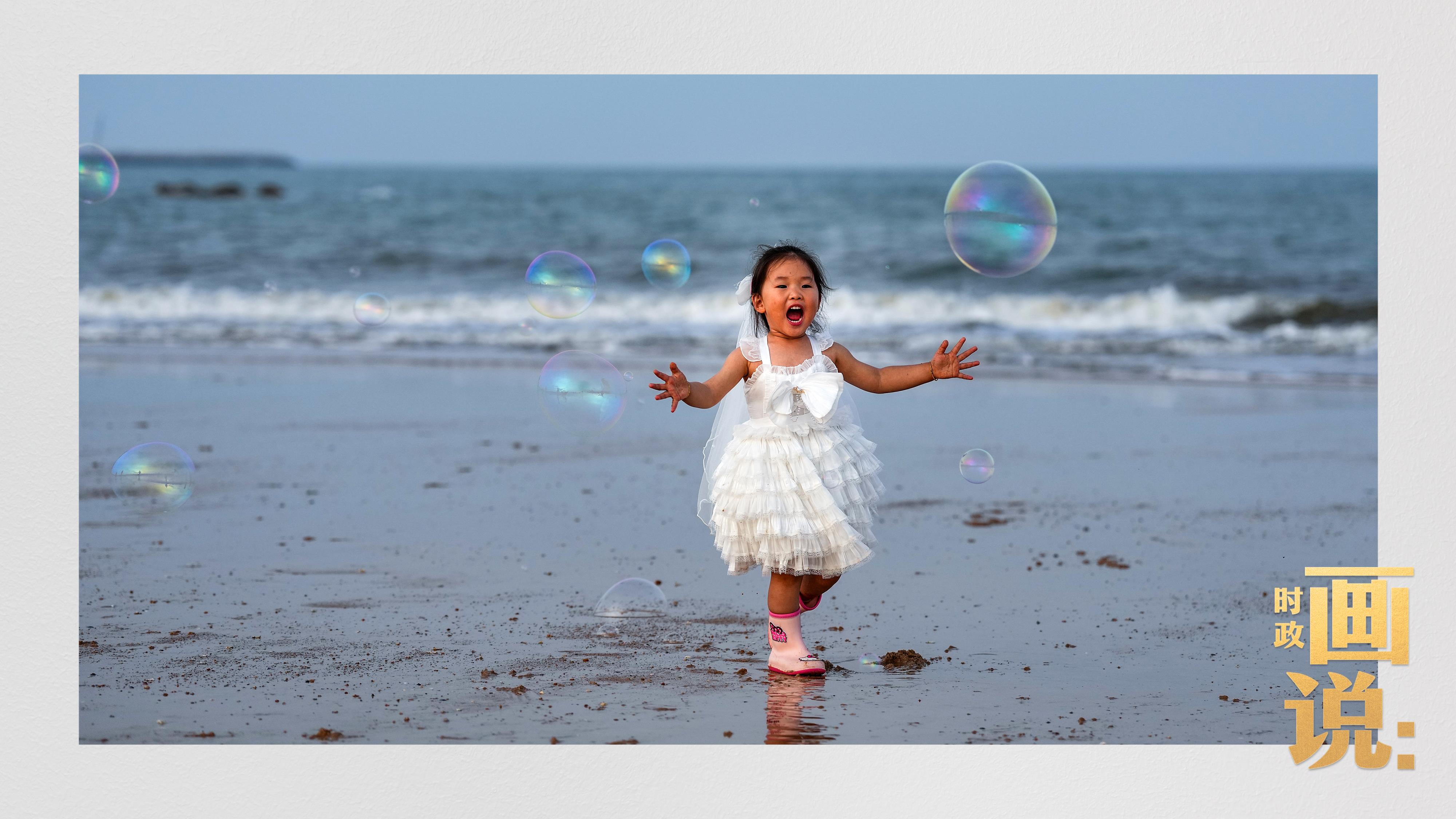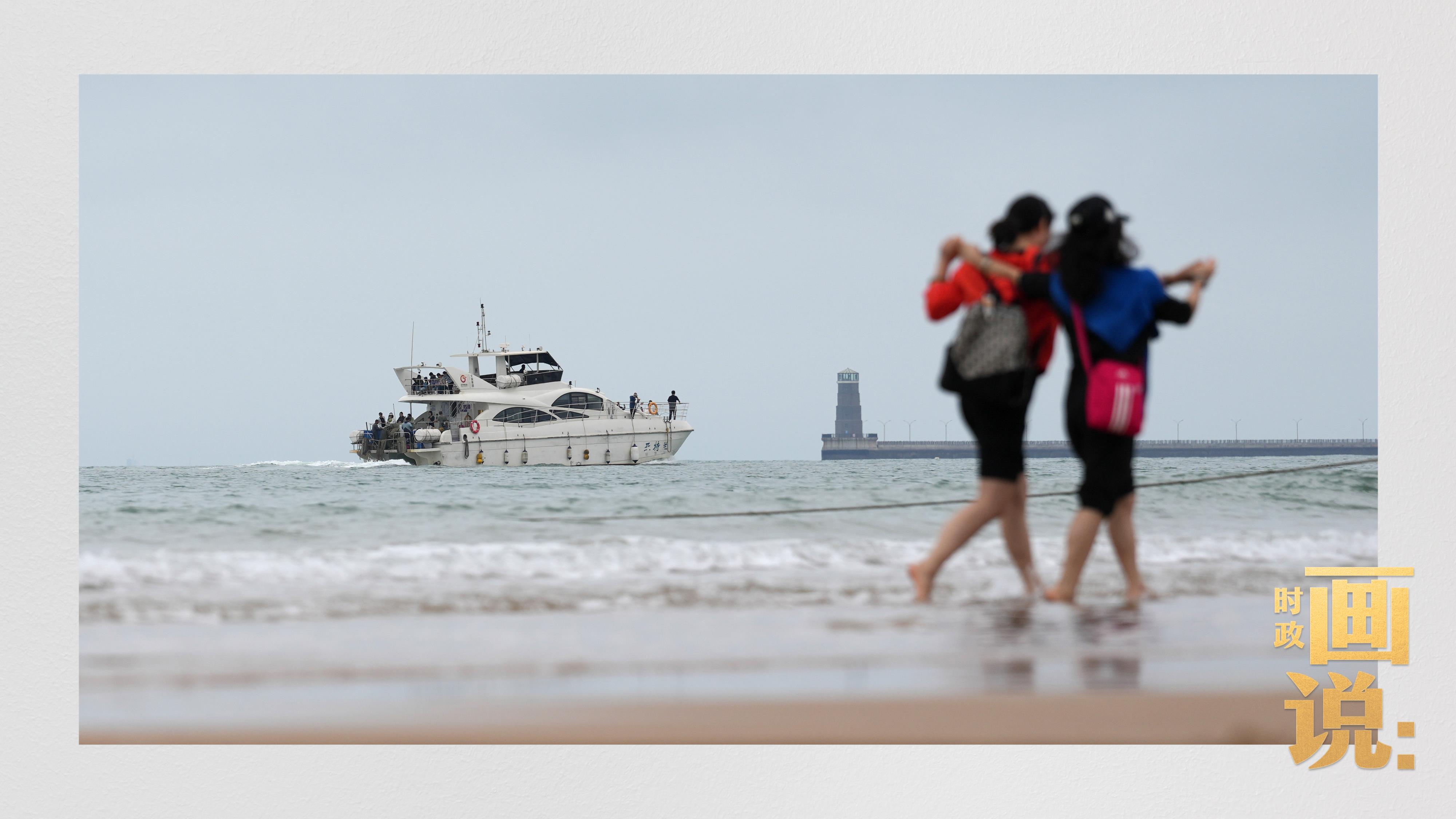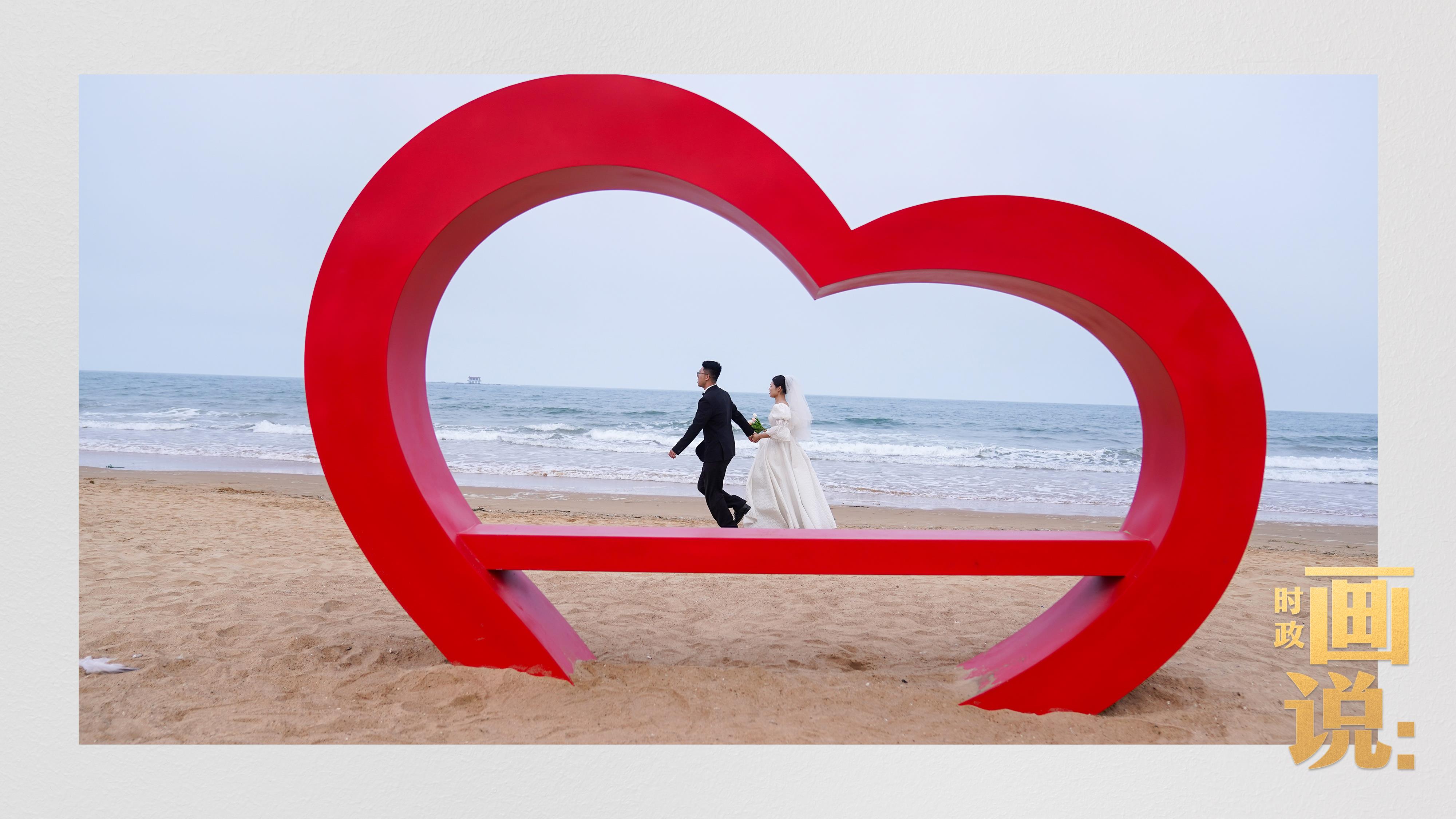 △日照陽光海岸綠道上的萬平口景區(qū),一對游客在海浪中翩然起舞。