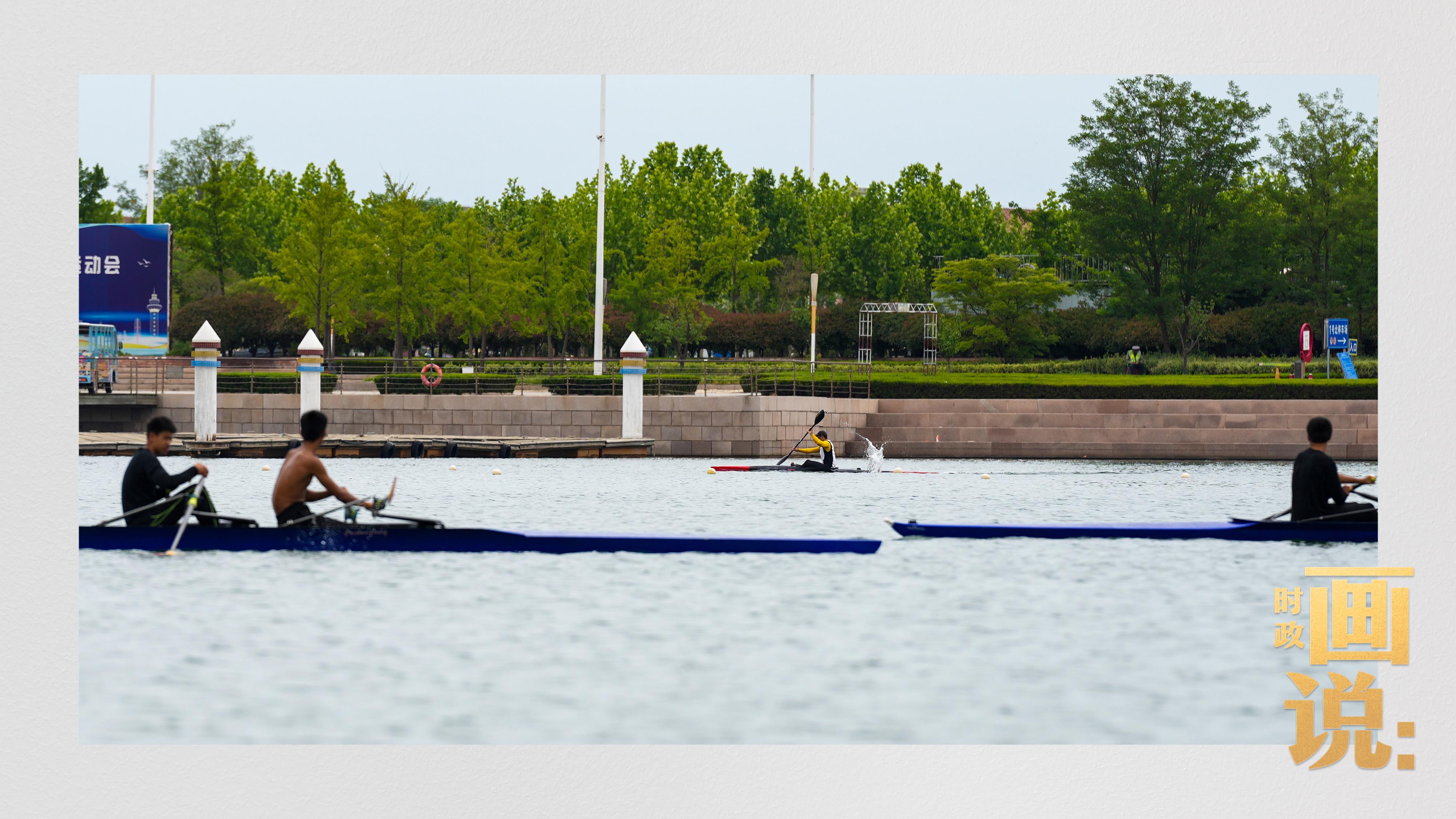 △奧林匹克水上公園碧波輕漾,皮劃艇運動員正在訓(xùn)練。