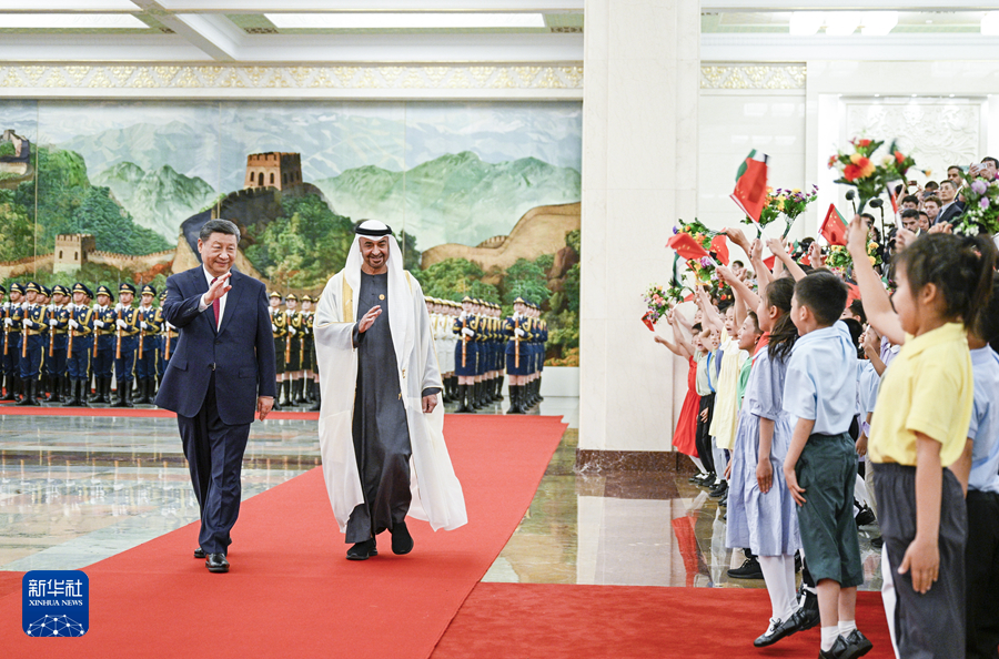 5月30日下午,國家主席習近平在北京人民大會堂同來華國事訪問并出席中國-阿拉伯國家合作論壇第十屆部長級會議開幕式的阿聯(lián)酋總統(tǒng)穆罕默德舉行會談。這是會談前,習近平在人民大會堂北大廳為穆罕默德舉行歡迎儀式。新華社記者 申宏 攝