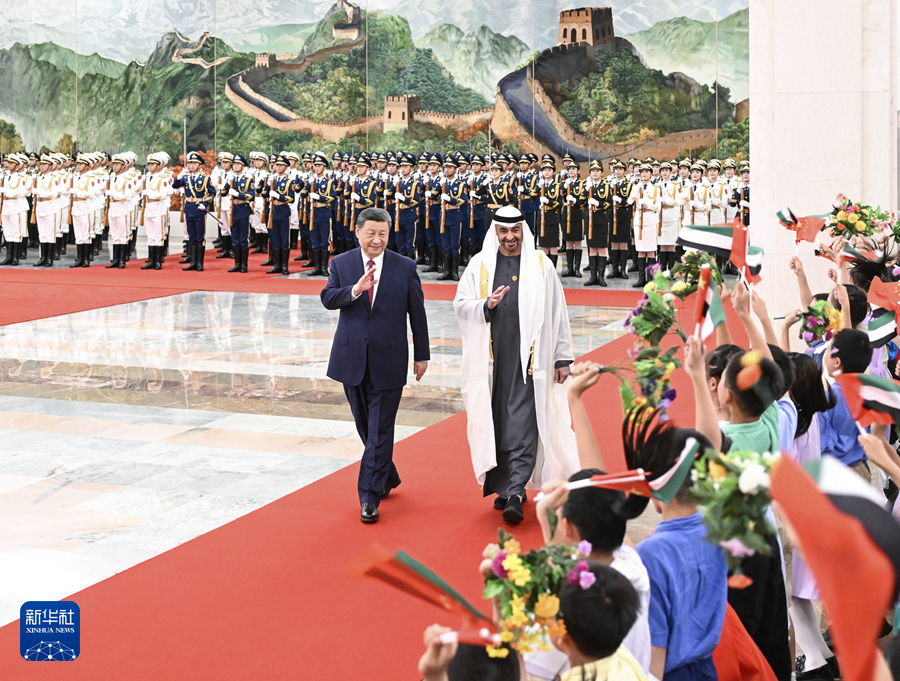5月30日下午,國家主席習近平在北京人民大會堂同來華國事訪問并出席中國-阿拉伯國家合作論壇第十屆部長級會議開幕式的阿聯(lián)酋總統(tǒng)穆罕默德舉行會談。這是會談前,習近平在人民大會堂北大廳為穆罕默德舉行歡迎儀式。新華社記者 饒愛民 攝
