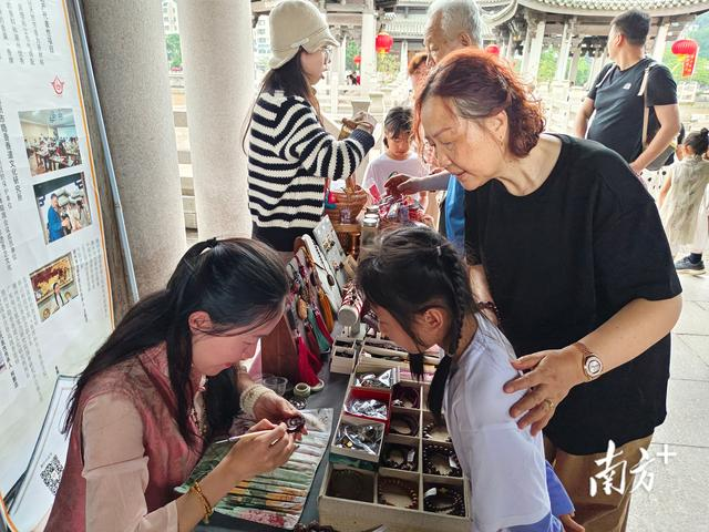 廣濟(jì)橋上,“潮玩古城·潮州非遺集市”活動(dòng)吸引游客體驗(yàn)。