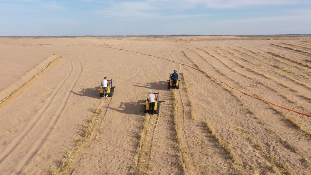 “過去我們不知道什么樣的機械適合在沙漠腹地運行,扎草方格和種苗一直依靠人工,效率很低?!倍庞儡娬f,烏拉特后旗沙化土地面積2065萬余畝,已經(jīng)治理的面積僅有459萬余畝,剩余治理任務(wù)重、難度大,很多地方連路都沒有,光靠人工背著草和樹進去,耗時太長,“‘人海戰(zhàn)術(shù)’已經(jīng)難以滿足新時代防沙治沙需求”。