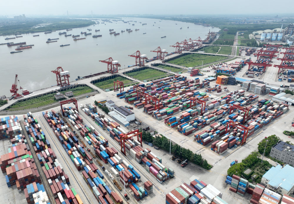 2024年6月1日拍攝的湖北武漢陽(yáng)邏港(無(wú)人機(jī)照片)。2013年時(shí),陽(yáng)邏港僅有兩條集裝箱航線,船型小、班期少;如今,陽(yáng)邏港已開通各類集裝箱航線20余條,實(shí)現(xiàn)“航運(yùn)向東入海、班列向西入歐”。