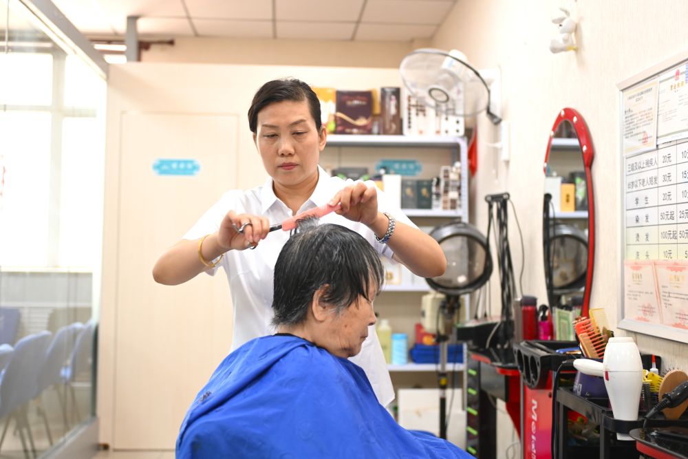 6月20日,長城花園社區(qū)的志愿者為居民理發(fā)。